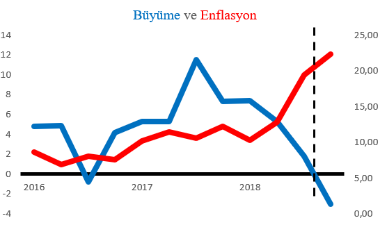 Türkiye, 2018 yılının son çeyreğindeki ortalama yüzde 22,4 enflasyon ve yüzde 3 küçülmeyle birlikte slumpflasyona girmiş bulunuyor. Slumpflasyon (enflasyon içinde küçülme) bir ülkede yüksek enflasyon olgusuyla birlikte ekonomik küçülme de yaşanması halini anlatan bir kriz durumudur. Aşağıdaki grafik, Türkiye’nin 2016 – 2018 arasında çeyrek dönemler itibariyle büyüme ve enflasyon oranlarını gösteriyor.**