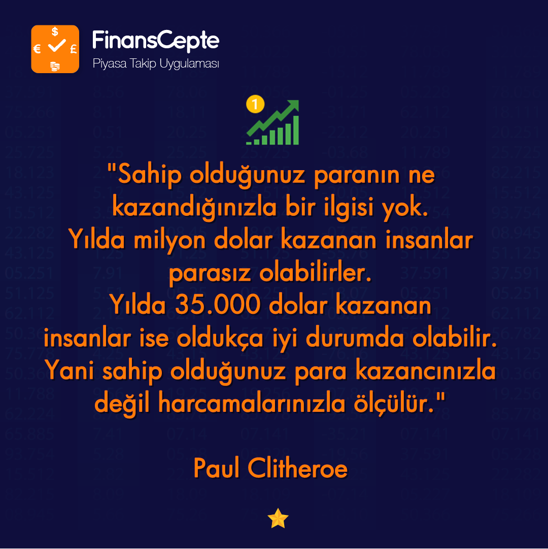 5.Sahip olduğunuz paranın ne kazandığınızla bir ilgisi yok. Yılda milyon dolar kazanan insanlar parasız olabilirler. Yılda 35.000 dolar kazanan insanlar ise oldukça iyi durumda olabilir. Yani sahip olduğunuz para kazancınızla değil harcamalarınızla ölçülür. - Paul Clitheroe