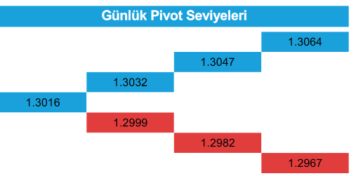 Parite debugün dünün en düşüğü 1,2990 seviyesinin altında 1,2972 ve1,2950 seviyeleri destek noktaları takip edilebilir. Olası yükselişlerde ise 1,3051’in aşılması durumunda 1,3065 ve 11 günlük üssel ortalamaların bulunduğu 1,3110 seviyeleri direnç noktaları olarak izlenecektir.