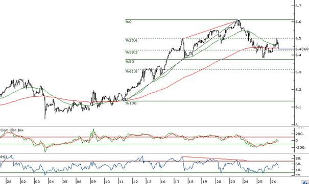 Dolar/TL’de 6.60 seviyesinden başlayan düzeltme hareketinde %50 fibonacci seviyesi olan 6.38 desteği görülmesinin artından tepki yükselişi süreci 6.50 seviyesinde tamamlanarak 6.41 seviyesinin üzerinde taban oluşumu devam etmektedir.