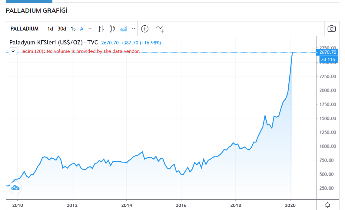 Tarihsel olarak, paladyumun fiyatı önceki dönemlere kıyasla 2001'den 2016'ya kadar daha oynaktı. Ardından Ekim 2017'de ilk kez 1.000 doları aştı ve 2019 Şubat'ta 1.500 dolar seviyesini geçti. Şu anda ise paladyum 2.600 dolardan işlem görüyor.