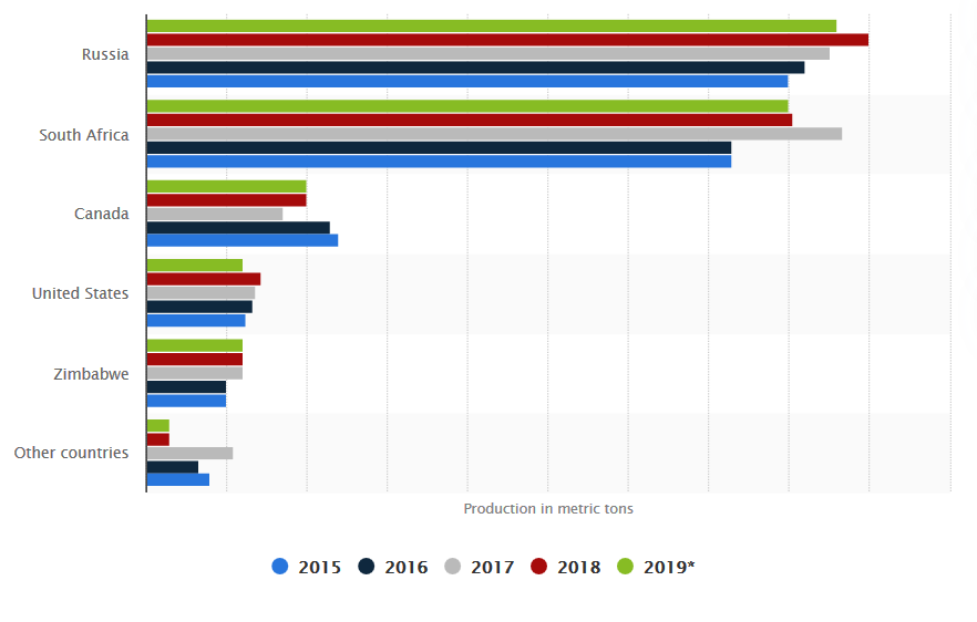 2018'de madenciler 200.000 tondan fazla paladyum çıkardı. En fazla paladyum üretimi yapan Rusya 85.000 ton üretti. Güney Afrika 68.000 tonla ikinci, Kanada 17.000 tonla üçüncü oldu. Amerika Birleşik Devletleri 14.000 ton üretti ve Zimbabve 12.000 ton üreterek beşinci oldu.