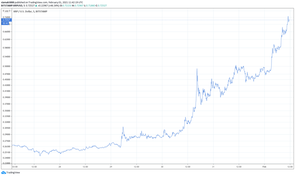 TradingView'in kripto para borsası Bitstamp'taki verilere göre, 1 Şubat Pazartesi günü XRP fiyatı 24 Kasım 2020'den bu yana ilk kez 0,70 $ seviyesinin üzerine çıktı.