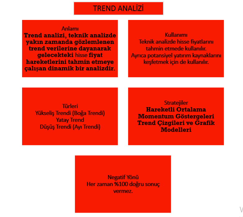Trend analizi, teknik analizde yakın zamanda gözlemlenen trend verilerine dayanarak gelecekteki hisse senedi fiyat hareketlerini tahmin etmeye çalışan dinamik bir analizdir. Trend analizindeki ana fikir, geçmişte hisselerde görülmüş olan hareketlerin gelecekte neler olacağı konusunda yatırımcılara bir fikir vermesidir. Yükselen, yatay ve düşüş trendi olmak üzere 3 temel trend türü vardır.